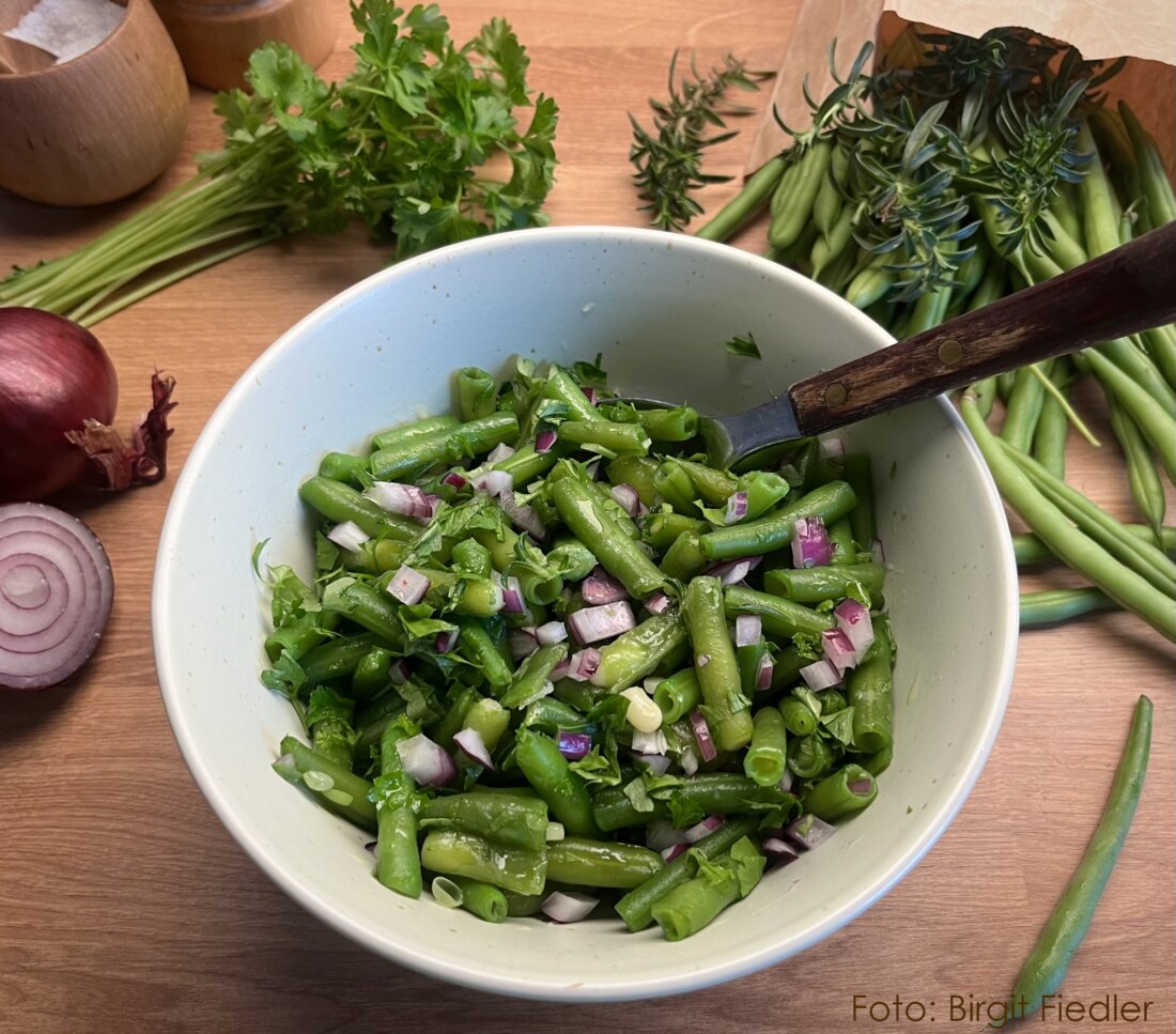 - Bohnen schnippeln und mit etwas Bohnenkraut 8 Minuten kochen, anschließend sofort in Eiswasser (erhält die frische Farbe)