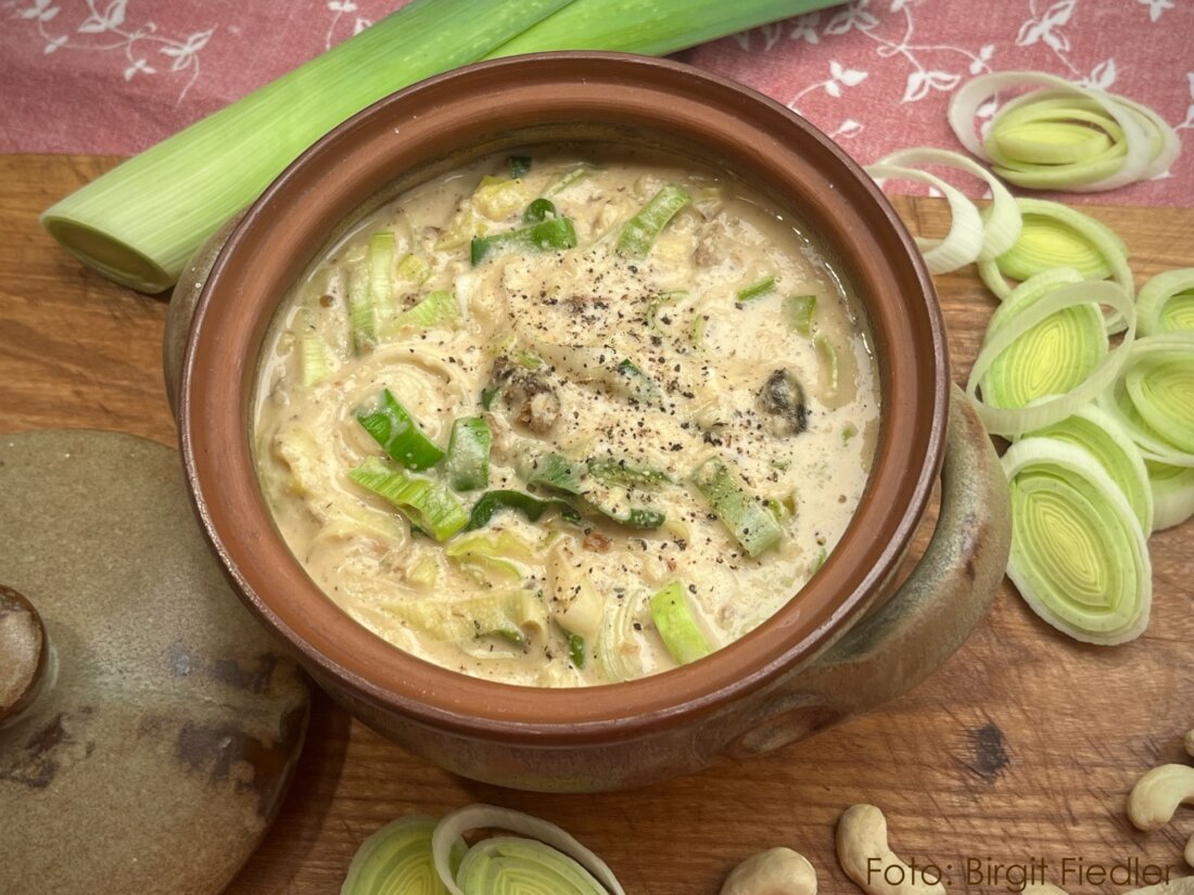 - Porree in Ringe schneiden und im Topf mit dem Brot etwas anbraten