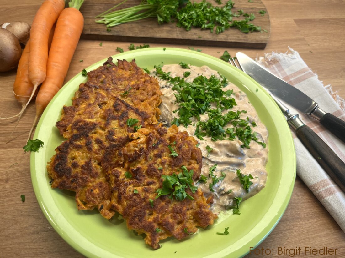 - Möhrenmasse zu flachen Bratlingen formen oder gleich portionsweise in die Pfanne geben und von beiden Seiten braten