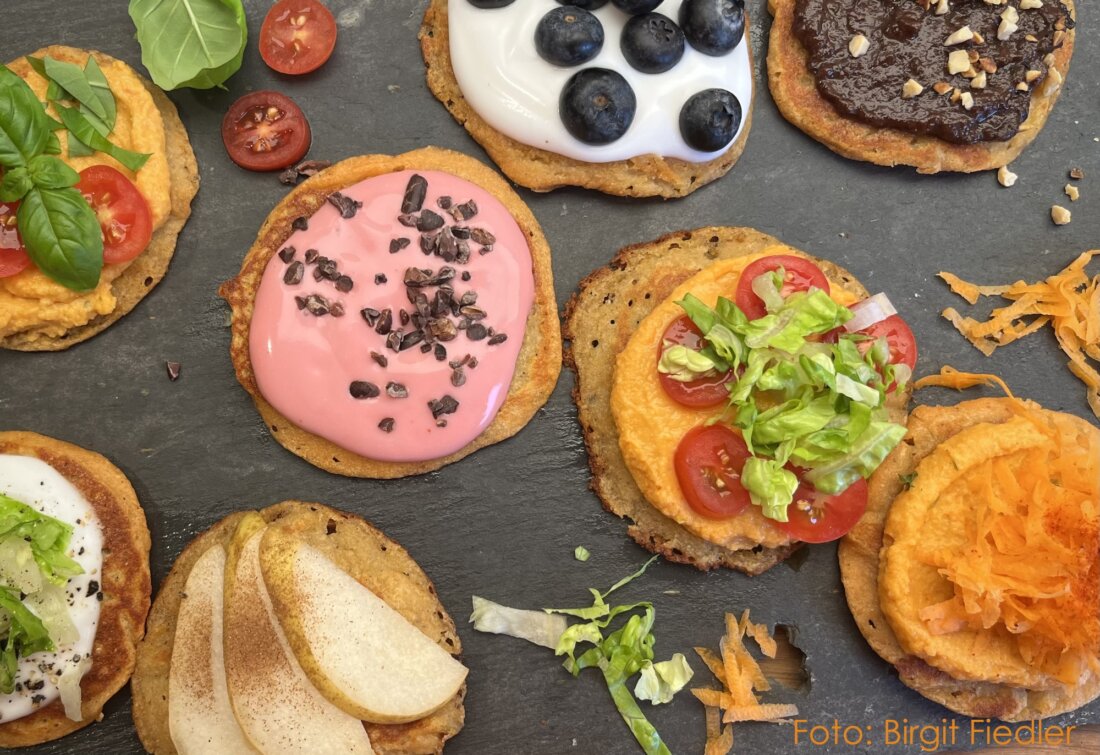 - nach Belieben herzhaft/fruchtig/süß belegen/bestreichen/bestreuen